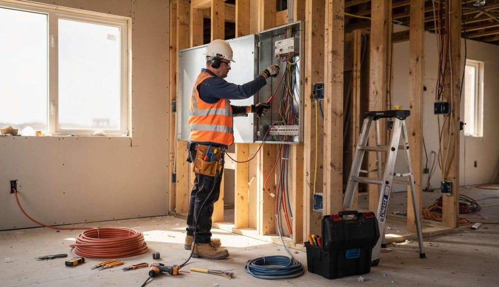 L’intervention de l’électricien se fait en plusieurs temps, en parfaite harmonie avec le gros œuvre et le second œuvre. Il doit d’abord collaborer avec le maçon pour la réalisation des saignées (tranchées dans les murs) destinées à encastrer les gaines. Ensuite, une coordination précise avec le plaquiste est nécessaire pour positionner les boîtes d’encastrement avant que les cloisons ne soient fermées. Une erreur de quelques centimètres peut avoir des conséquences importantes.